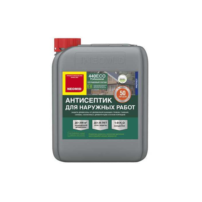 NEOMID 440 ECO – бесцветное средство для наружных и внутренних работ, в том числе для помещений с повышенной влажностью. Предназначено для защиты древесины различных пород от гниения, поражения дереворазрушающими и деревоокрашивающими плесневыми грибами, насекомыми-древоточцами, водорослями, мхами, лишайниками на срок до 25 лет (если закрыт пленкообразующим составом, например, лессирующим средством NEOMID BiOCOLOR).