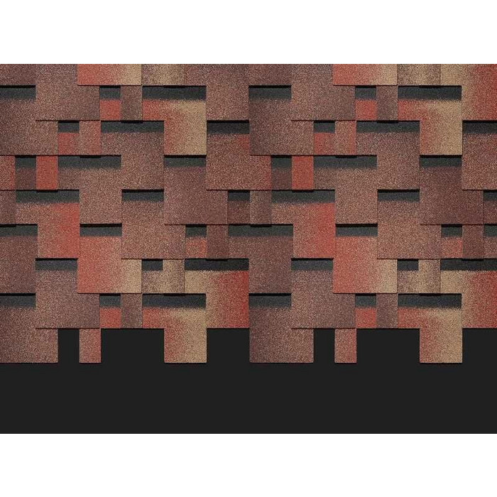 Яркие переходы оттенков, лепестки гонтов оригинальной формы, визуальный эффект объема сделают выразительной самую простую кровлю. Матовый блеск гранулята подчеркивает класс материала. Черепица удачно дополнит фасады в бежевых и терракотовых оттенках.