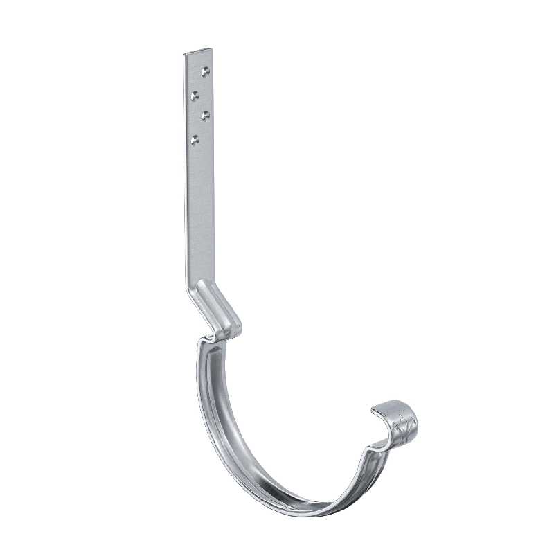 Крюк крепления желоба — цельнометаллический, изготовлен из стали толщиной 4 мм. Обеспечивает силовую поддержку желоба и неизменность его геометрических параметров, создаёт уклон, необходимый для движения воды в заданном направлении. Благодаря ребрам жесткости обладает повышенной прочностью, выдерживает большие силовые нагрузки.-Задний замок выполнен со смещением, что позволяет обеспечить наличие вентиляционного зазора между желобом и лобовой доской -Увеличенное «монтажное плечо» крюка (160 мм – длинный крюк; 230 мм – удлиненный крюк) удобный монтаж на разные уклоны крыши-Дополнительное ребро жесткости,  увеличивающее прочность и надежность крюка-Особая марка стали повышенной прочности, цельнометаллическая полоса толщиной 4 мм с оцинковкой 275 г/м.кв.-Уникальность подтверждает фирменный штамп «лилия» расположенный в передней части.