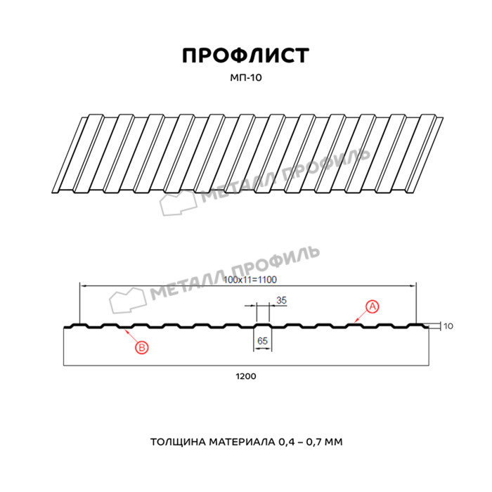 Весьма востребованный в Советском вид профлиста категории «стеновой». Он отличается не очень выразительной высотой волны – 10 мм и симметричным рисунком. пропорциям, МП-10 нашёл широкое применение в самых разных областях строительства. Чаще всего этот профнастил востребован для обшивки стен жилых и торговых зданий, создания различных ограждений, постройки стен и перегородок, а также в качестве подвесного потолка в индустриальных сооружениях. Для выпуска указанного профиля используется высококачественная сталь холодного проката толщиной от 0,4 до 0,7 мм. Стальная основа покрывается цинком, а также на неё наносится полимерный слой. Декоративное полимерное покрытие из каталога Компании Металл Профиль прекрасно впишется в любое архитектурное решение в современном стиле. Кроме того оно обеспечит металлу дополнительную защиту от ультрафиолета, коррозии, механических воздействий.
