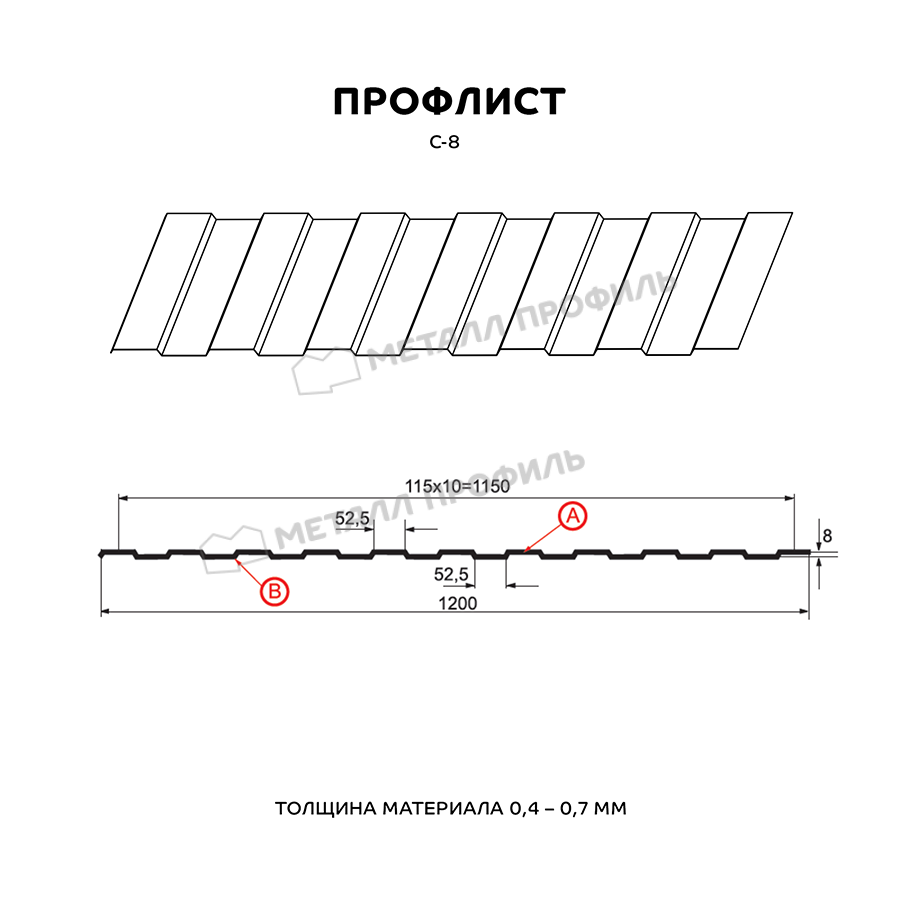 Профнастил с самой низкой трапецией в линейке Компании Металл Профиль. Назначение профиля С-8 – в большей степени дизайнерская функция, чем несущая. Этот профнастил отлично справляется с такими задачами, как: внутренняя отделка промышленных помещений, монтаж вентилируемых фасадов, возведение заборов, не подверженных большим снеговым и ветровым нагрузкам, системы подвесных потолков. Симметричная конфигурация проката делает С-8 довольно удобным исходным материалом для различных архитектурных замыслов. Достаточная толщина стали – от 0,4 до 0,7 мм даёт возможность объектам из профлиста успешно справляться с любым своим назначением. А большая полезная ширина (1150 мм) помогает сэкономить на закупке профлистов. По вашему заказу мы можем изготовить листы металлопроката длиной от 0,5 до 12 метров.