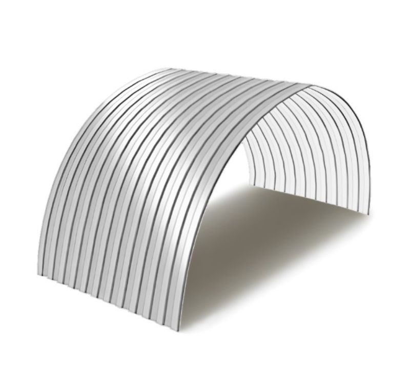 Профнастил для арочных перекрытий используется прежде всего при строительстве различных арочных конструкций, у которых существует определенный изгиб по радиусу. Он активно применяется при возведении ангаров, складов, зернохранилищ, различных округлых и полукруглых вариантов крыш и кровли. С его помощью можно построить как большое здание сельскохозяйственного назначения, так и красивый эстетичный навес для автомобиля площадью несколько квадратных метров. Основной отличительной особенностью данного вида профлиста является его изогнутая по радиусу форма, сформированная на специально предназначенной для этого профилегибочной линии. Радиус изгиба может быть самый разнообразный, и зависит прежде всего, от требований заказчика и характеристик будущего здания. Плюсами такого материала являются как его изготовление в заводских условиях, так и геометрическая точность, в результате чего стыки листов практически не видны и конструкция выглядит действительно монолитной.