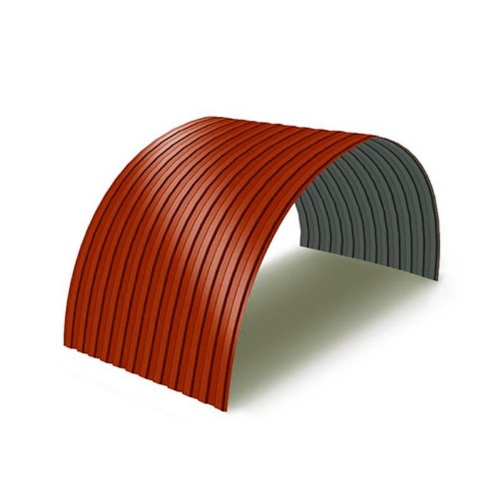 Профнастил для арочных перекрытий используется прежде всего при строительстве различных арочных конструкций, у которых существует определенный изгиб по радиусу. Он активно применяется при возведении ангаров, складов, зернохранилищ, различных округлых и полукруглых вариантов крыш и кровли. С его помощью можно построить как большое здание сельскохозяйственного назначения, так и красивый эстетичный навес для автомобиля площадью несколько квадратных метров. Основной отличительной особенностью данного вида профлиста является его изогнутая по радиусу форма, сформированная на специально предназначенной для этого профилегибочной линии. Радиус изгиба может быть самый разнообразный, и зависит прежде всего, от требований заказчика и характеристик будущего здания. Плюсами такого материала являются как его изготовление в заводских условиях, так и геометрическая точность, в результате чего стыки листов практически не видны и конструкция выглядит действительно монолитной.